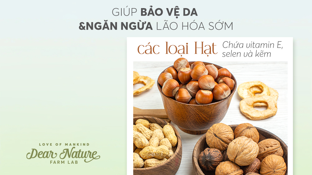 Hạnh nhân, óc chó, hạt điều... chứa nhiều vitamin E, selen và kẽm, khi kết hợp lại, vitamin E, selen và kẽm tạo thành một lá chắn bảo vệ da toàn diện: