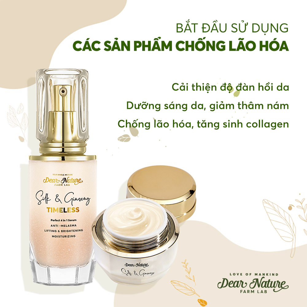 Dear Nature tự hào mang đến cho bạn Bộ đôi chống lão hóa, mờ thâm nám Timeless Silk & Ginseng gồm Tinh chất ngừa nám và Kem dưỡng da chống lão hoá- hội tụ tinh túy từ các "Thảo dược vàng" thiết yếu cho làn da tươi trẻ: