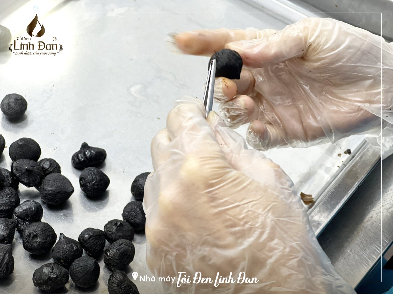 Bóc vỏ thủ công tỉ mỉ: Từng củ tỏi đen được bóc vỏ thủ công bởi đội ngũ nhân viên lành nghề, giữ nguyên vẹn hình dạng và chất lượng tinh túy.