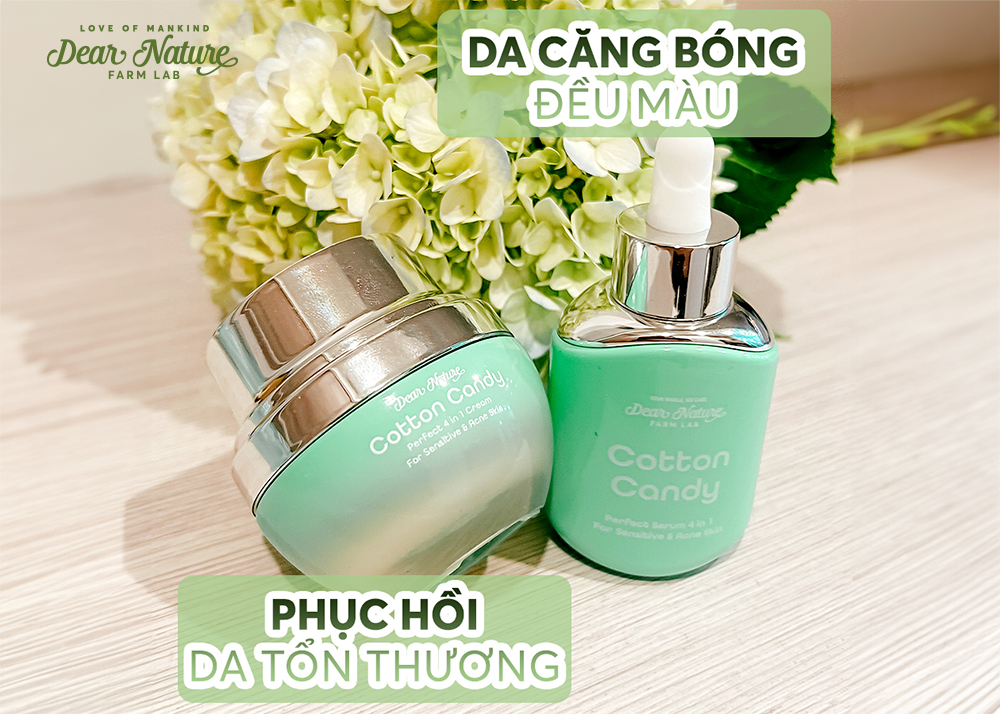 Cotton Candy Perfect Cream 4 in 1 với chiết xuất sâm, mật ong lên men, trà xanh giúp phục hồi và tăng cường tái tạo da, đặc biệt sau điều trị mụn. Các bí quyết từ thiên nhiên giúp dưỡng ẩm tối ưu, mờ thâm nám, giảm mẩn đỏ do mụn đem đến làn da căng bóng đều màu. Da sáng, đều màu hơn.