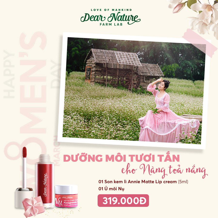𝐒𝐞𝐭 𝐪𝐮𝐚̀ 𝐃𝐮̛𝐨̛̃𝐧𝐠 𝐌𝐨̂𝐢 𝐓𝐮̛𝐨̛𝐢 𝐓𝐚̆́𝐧 – 𝐂𝐡𝐨 𝐧𝐚̀𝐧𝐠 𝐭𝐨𝐚̉ 𝐧𝐚̆́𝐧𝐠: Khi mua 01 Son kem lì Annie Matte Lip cream 5ml TẶNG 01 ủ môi Nụ. 𝐆𝐢𝐚́ 𝐤𝐡𝐮𝐲𝐞̂́𝐧 𝐦𝐚̣𝐢: 𝟑𝟏𝟗,𝟎𝟎𝟎