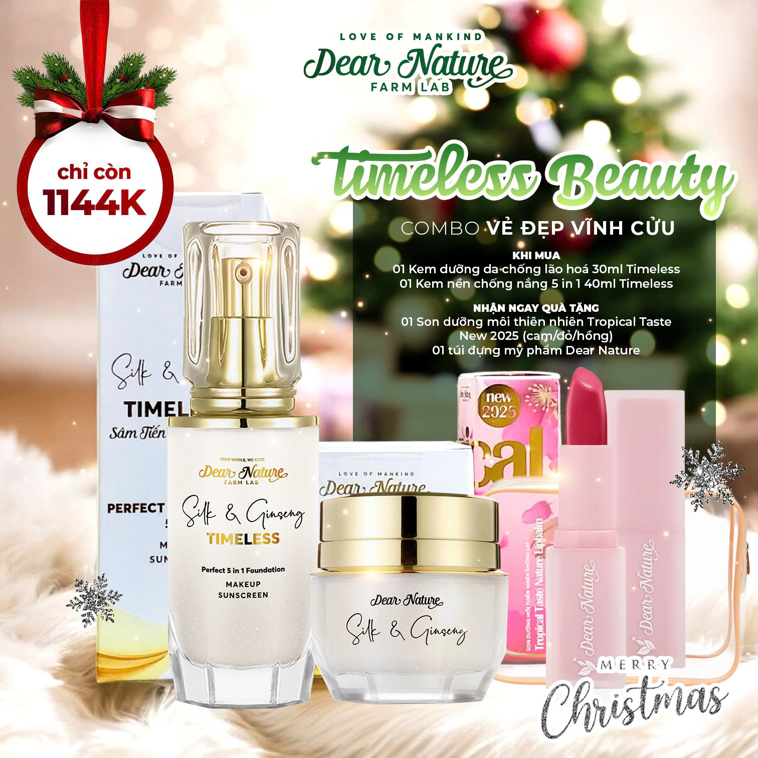 - Mua 01 Kem dưỡng da chống lão hoá Sâm tiến hoàng cung 4 in 1 Timeless Silk & Ginseng Perfect Cream 30ml và 01 Kem nền chống nắng Sâm tiến hoàng cung 5 in 1 Timeless Silk & Ginseng perfect Foundation 40ml TẶNG 01 Son dưỡng môi thiên nhiên có màu Tropical Taste Nature Lipbalm New 2025 (màu bất kì: cam, đỏ, hồng), và 01 túi đựng mỹ phẩm Dear Nature trong suốt hình chữ nhật