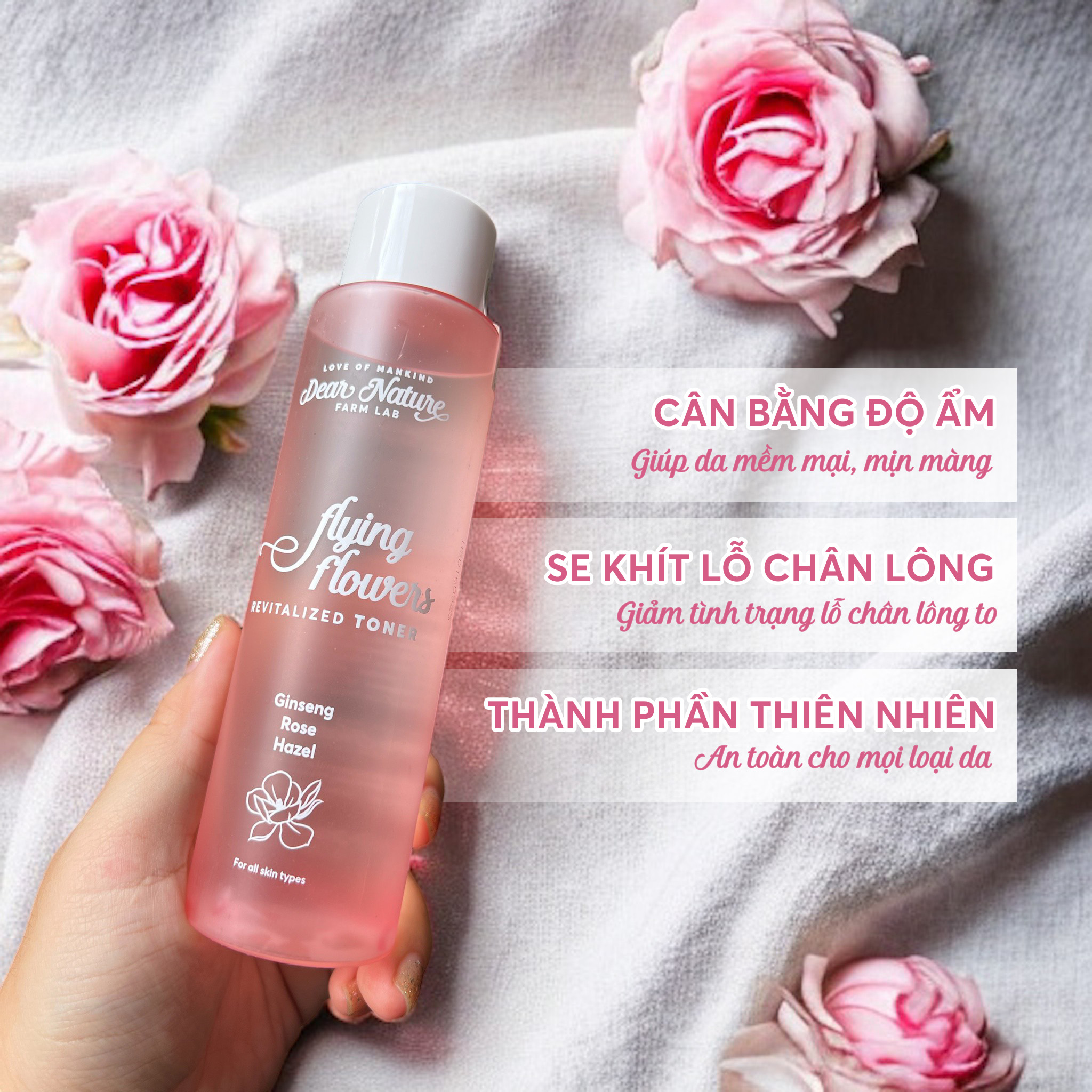 - Thành phần thiên nhiên: Chiết xuất từ hoa hồng, rau má, lô hội, sâm hoa cúc, an toàn và dịu nhẹ cho da.