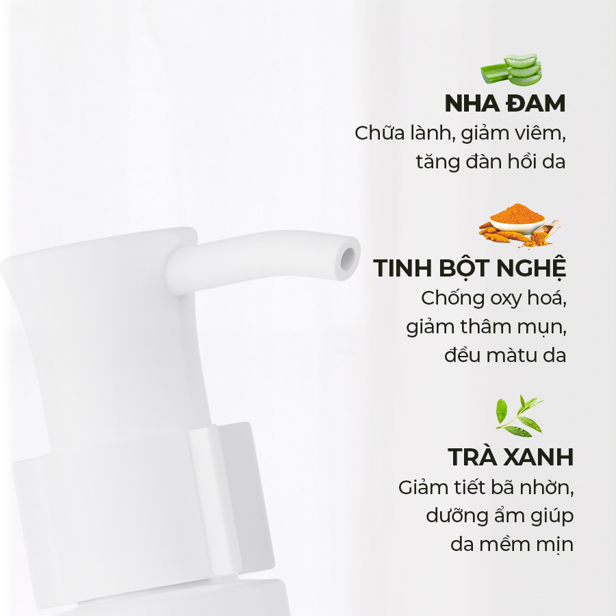 - Gel rửa mặt Nghệ - Nha đam - Trà xanh với công thức dịu nhẹ, không chứa xà phòng, giúp loại bỏ bụi bẩn, dầu nhờn trên da mà không gây khô căng, kích ứng. Nhờ vậy, da được làm sạch một cách nhẹ nhàng, thông thoáng, tạo nền tảng hoàn hảo để tiếp nhận các dưỡng chất ở các bước sau.