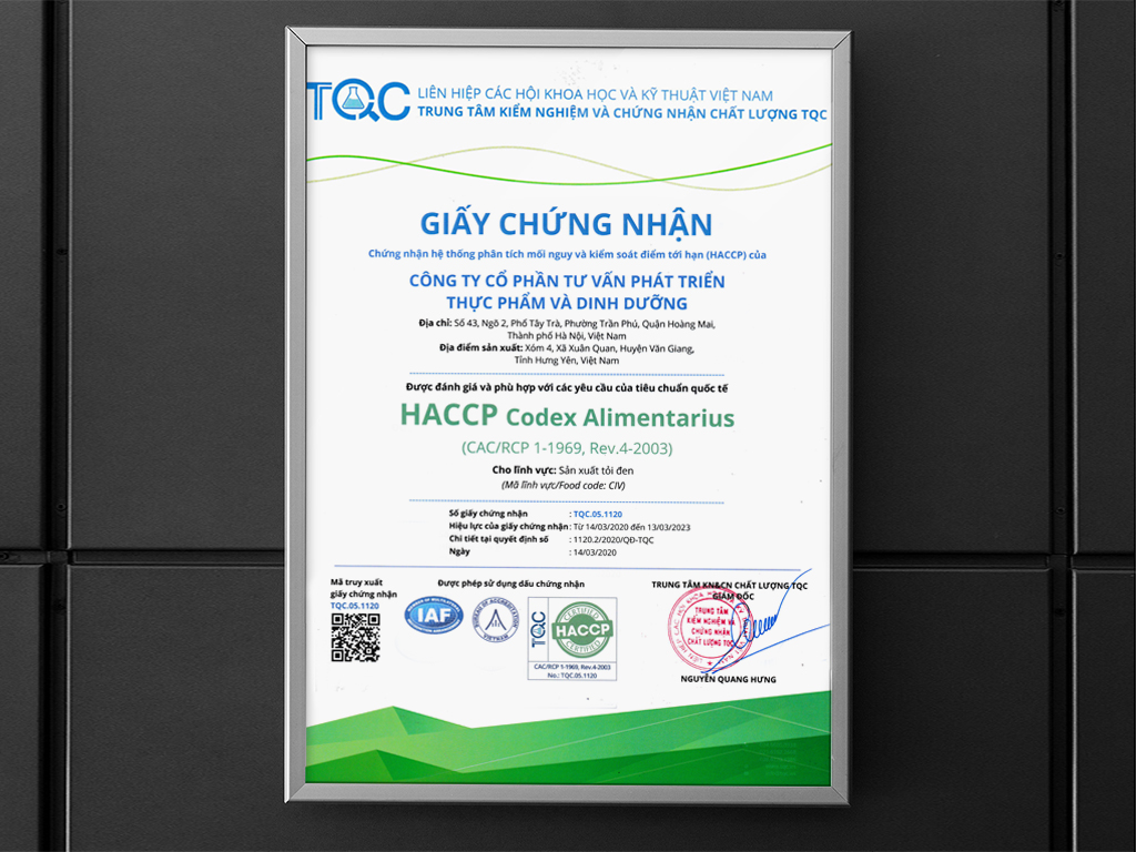 2020: Trung Tâm Nghiên cứu Thực phẩm và Dinh Dưỡng nhận giấy chứng nhận quốc tế về hệ thống phân tích mối nguy và kiểm soát chất lượng HACCP