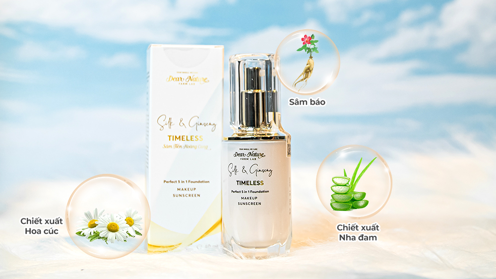 - Timeless Silk & Ginseng Perfect Foundation 5 in 1 là giải pháp thay thế tuyệt vời cho các bước: kem dưỡng, kem lót, kem nền, chống nắng. Vừa dưỡng ẩm chống lão hóa, vừa tạo lớp make up hoàn hảo, nâng tone nhẹ nhàng, vừa chống nắng tối ưu cho da với chỉ số SPF 50 PA+++.