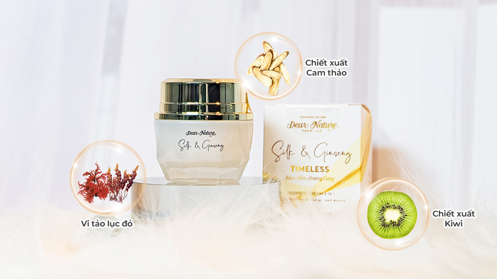 - Kem dưỡng da chống lão hoá Sâm tiến hoàng cung 4 in 1 Timeless Silk & Ginseng Perfect Cream sử dụng nhiều loại chiết xuất thiên nhiên quý giá có tác dụng tuyệt vời cho làn da. Sâm Tiến Vua là “chất cân bằng da tự nhiên”, Dầu Argan mệnh danh "vàng lỏng" xứ Maroc, hay Kiwi, Cam thảo bí quyết dưỡng da từ ngàn năm lưu truyền lại.