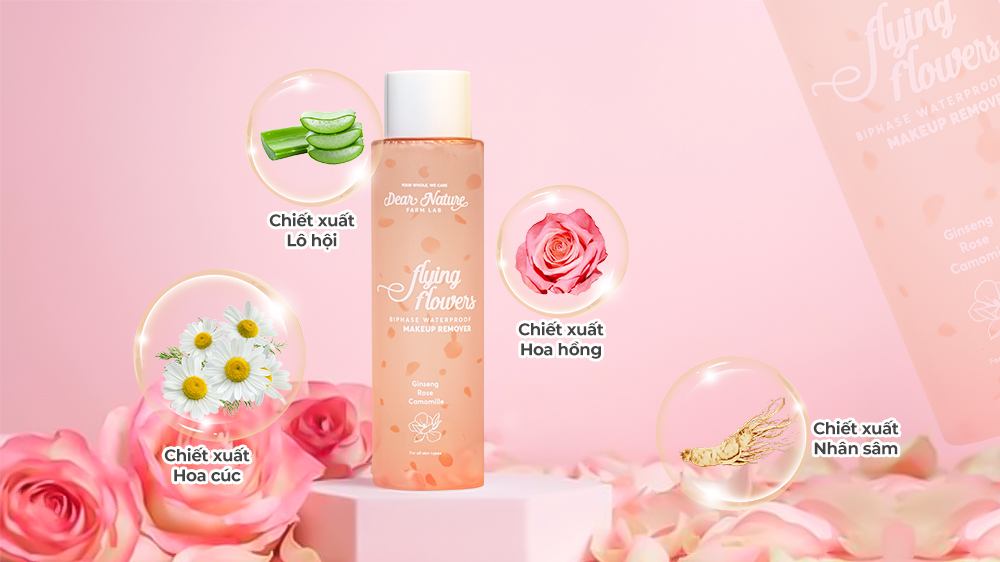 - Nước tẩy trang bi-phase Dear Nature với 2 lớp nước và dầu, nhẹ nhàng loại bỏ bụi bẩn, bã nhờn, lớp chống nắng, trang điểm nhẹ nhàng mà không gây khô da.