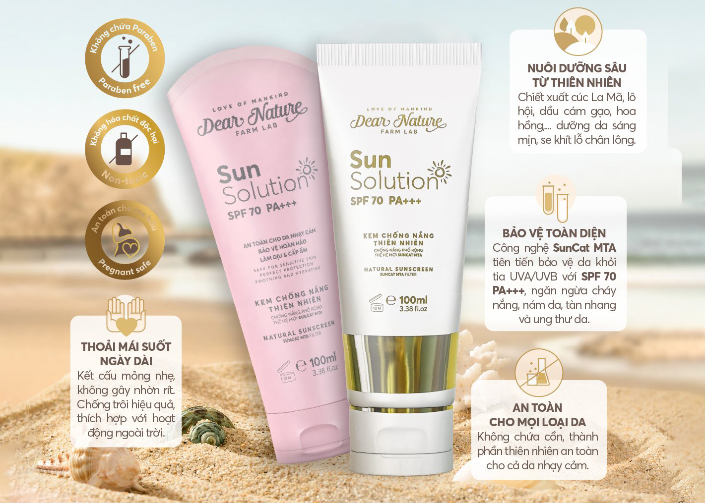 Dear Nature mang đến cho bạn hai lựa chọn kem chống nắng tuyệt vời cho mùa hè: Sun Solution "Trong mát" và "Phớt hồng". Cả hai sản phẩm đều có công dụng chính là bảo vệ da khỏi tác hại của tia UV, dưỡng ẩm và làm mát da. Tuy nhiên, chúng có điểm khác biệt về chất kem, mang đến trải nghiệm sử dụng riêng biệt cho từng loại da.