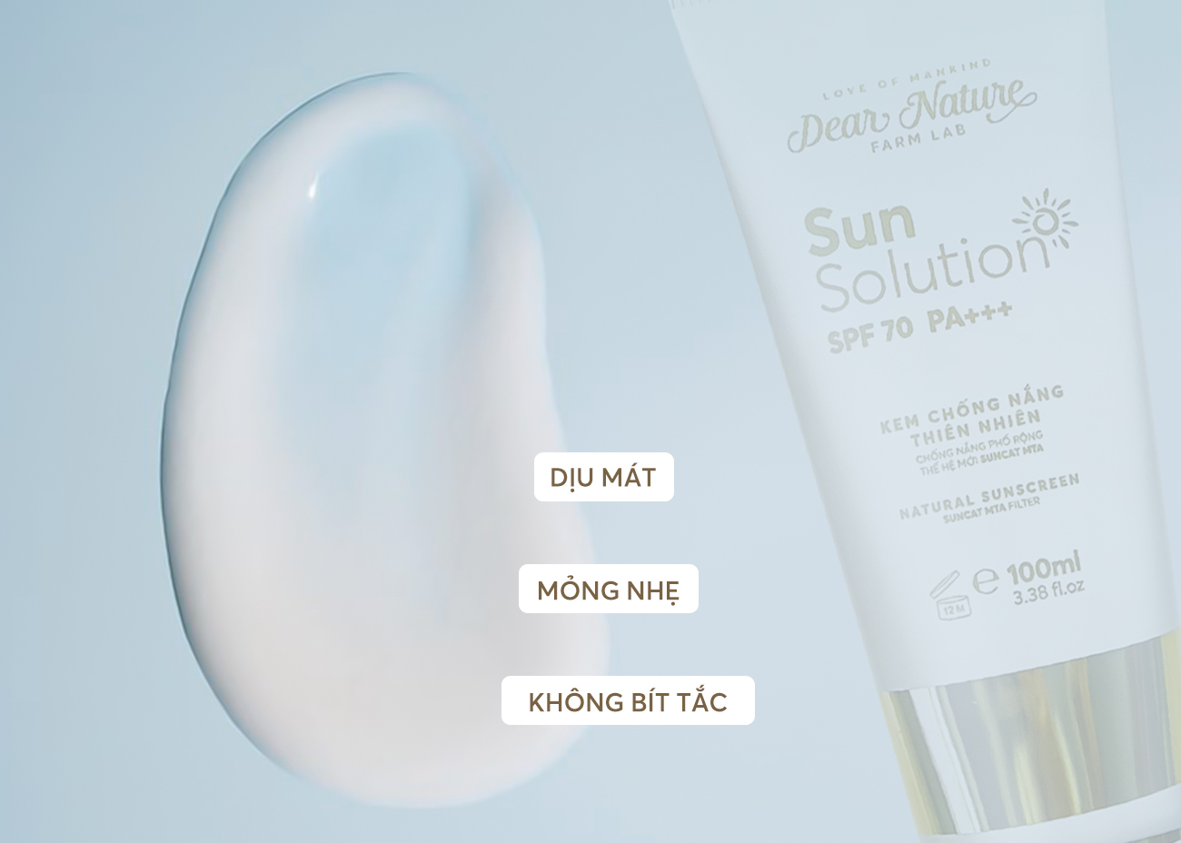 - Kem chống nắng Sun Solution "Trong mát": Chất kem sữa trắng mỏng nhẹ, thấm nhanh vào da, không gây nhờn rít, bí da. Phù hợp cho mọi loại da, đặc biệt là da dầu, da hỗn hợp.