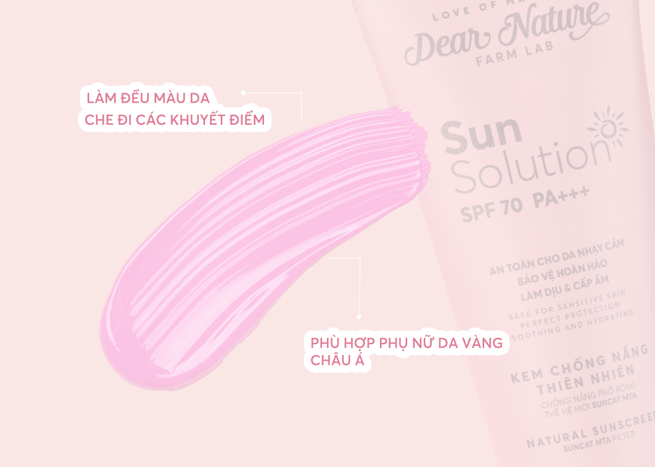 - Kem chống nắng Sun Solution "Phớt hồng": Chất kem "phớt hồng" độc đáo, giúp làm đều màu da, che đi các khuyết điểm như thâm nám, tàn nhang, tái nhợt. Phù hợp cho mọi loại da, đặc biệt là da ngăm, da vàng.