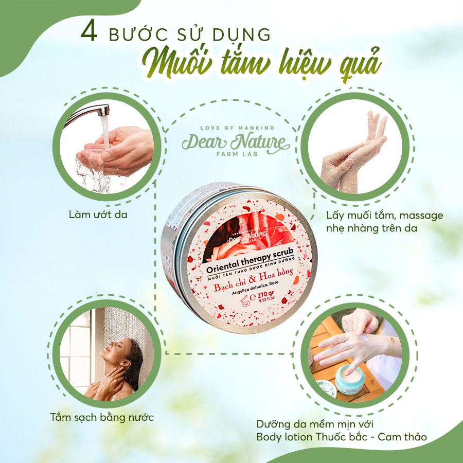 Với công thức độc đáo từ thiên nhiên cùng các hạt siêu mịn nhẹ nhàng loại bỏ đi lớp tế bào Nếu bạn đang tìm kiếm một sản phẩm làm sạch sâu và tẩy da chết hiệu quả, an toàn có nguồn gốc từ thiên nhiên, hãy tham khảo Muối tắm thảo dược dinh dưỡng - Oriental therapy scrub Bạch chỉ Hoa hồng nhà Dear Nature nhé. Nhanh tay cho sản phẩm vào giỏ hàng để sở hữu sớm nhất nào!