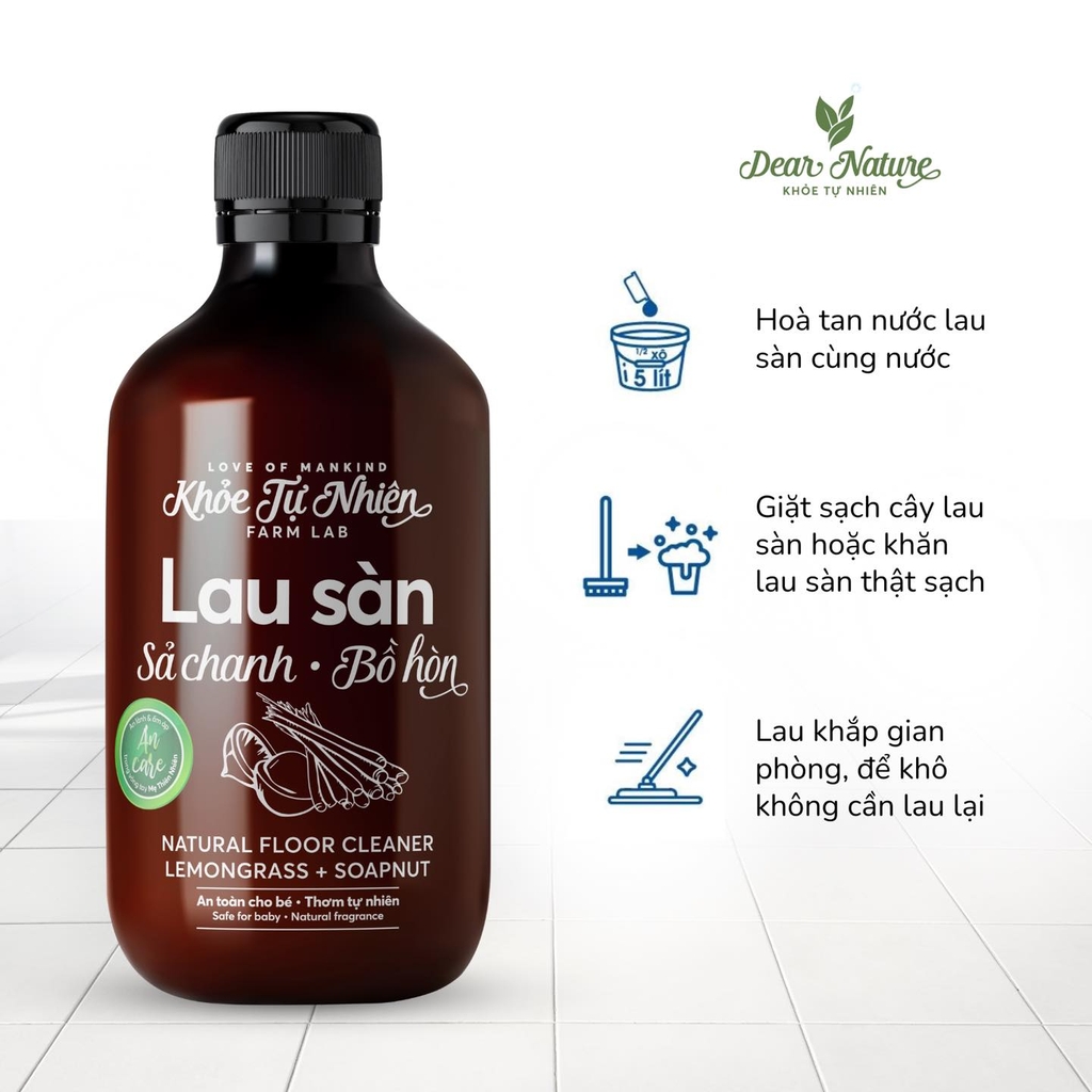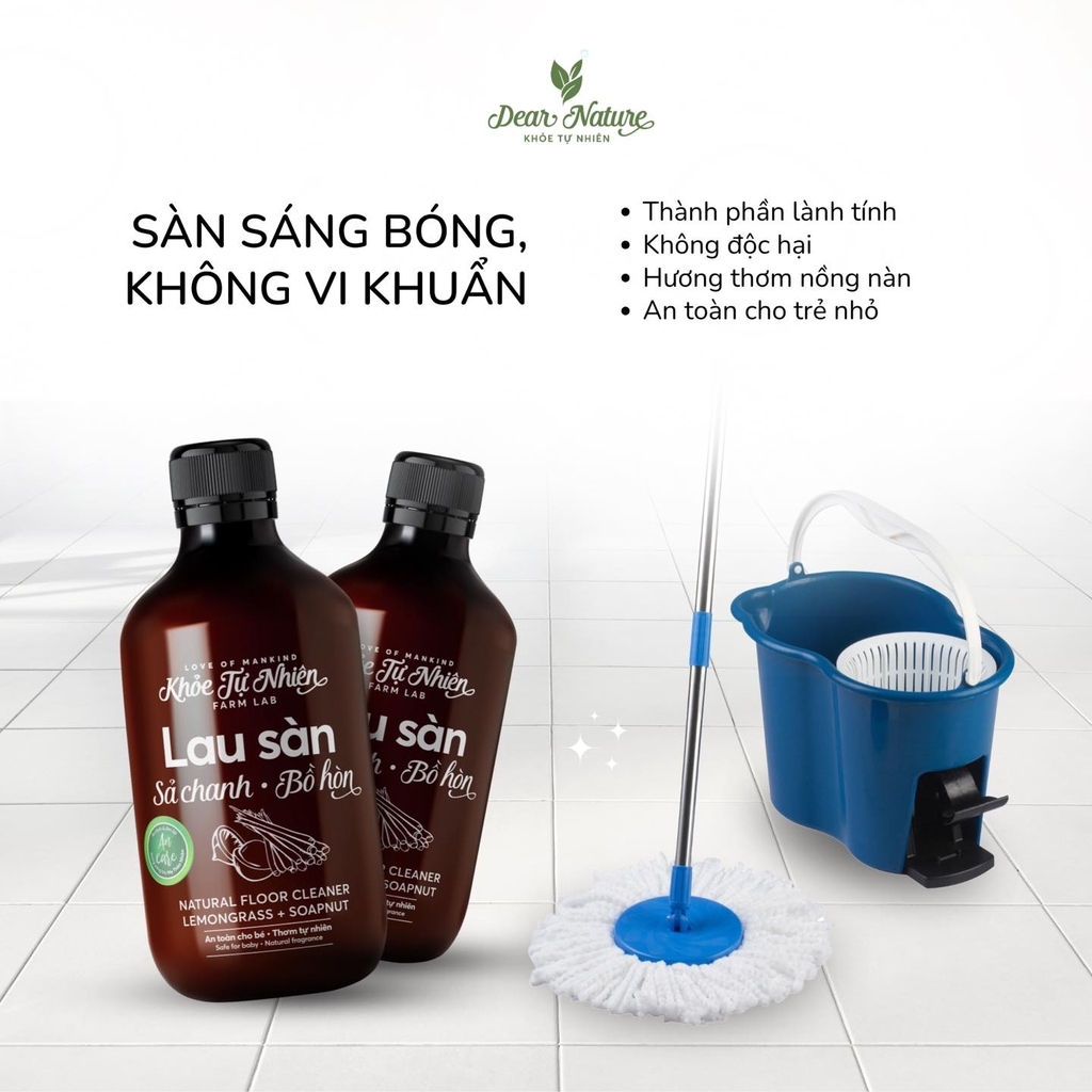 - Bồ Hòn - Sức mạnh làm sạch từ thiên nhiên: Sản phẩm sử dụng chiết xuất bồ hòn cô đặc, giàu saponin - một "chuyên gia" làm sạch đa năng. Saponin không chỉ tạo bọt mịn mà còn có khả năng len lỏi vào từng ngóc ngách, đánh bật các vết bẩn cứng đầu, dầu mỡ, trả lại vẻ sáng bóng cho sàn nhà của bạn. Đặc biệt, saponin hoàn toàn tự nhiên, không gây kích ứng, an toàn cho cả gia đình và vật nuôi, mang lại sự an tâm tuyệt đối cho người sử dụng.