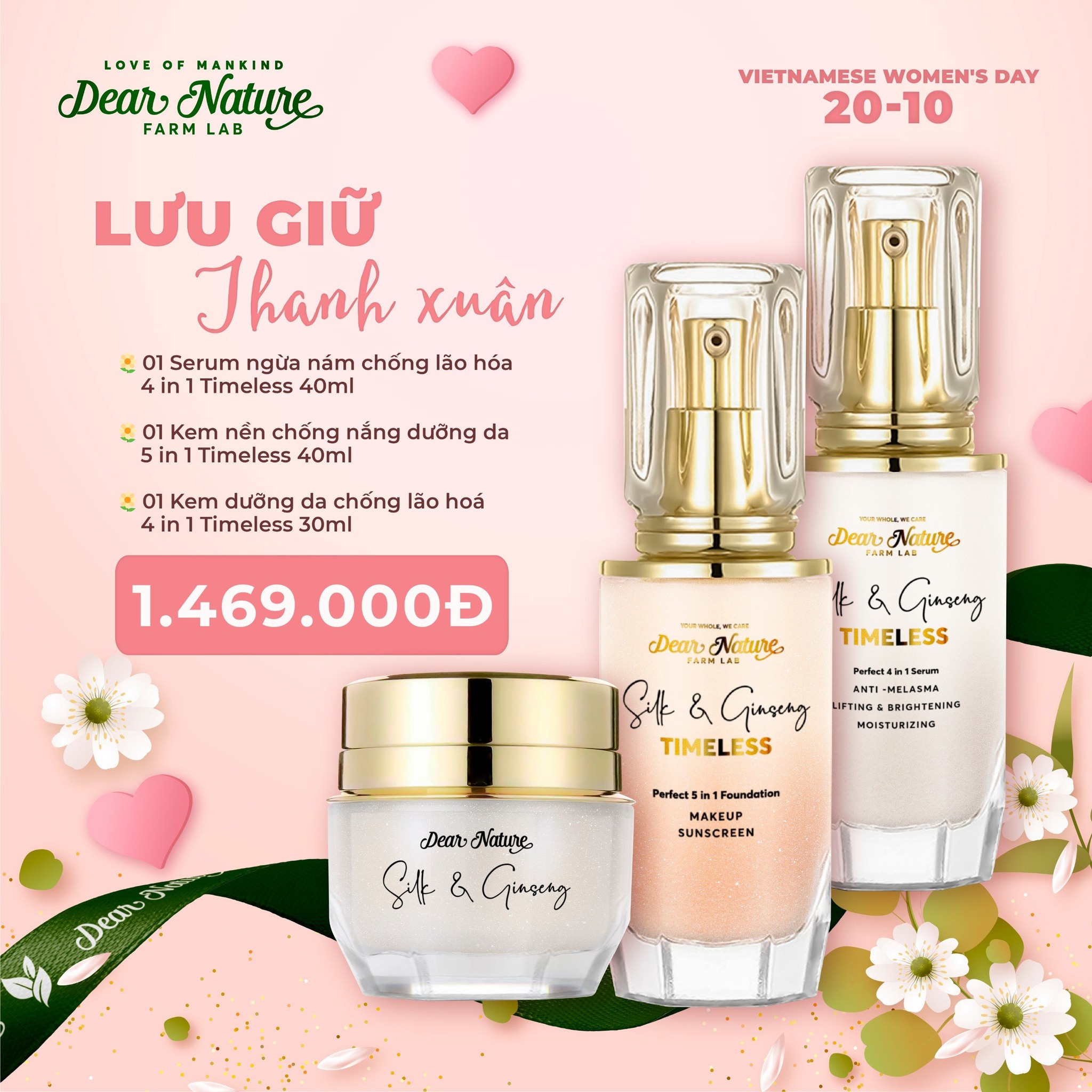 01 Serum ngừa nám chống lão hóa Sâm tiến hoàng cung 4in1 Timeless 40ml + 01 Kem nền chống nắng Sâm tiến hoàng cung 5in1 Timeless 40ml + 01 Kem dưỡng da chống lão hoá Sâm tiến hoàng cung 4in1 Timeless 30ml CHỈ CÒN 1.469K