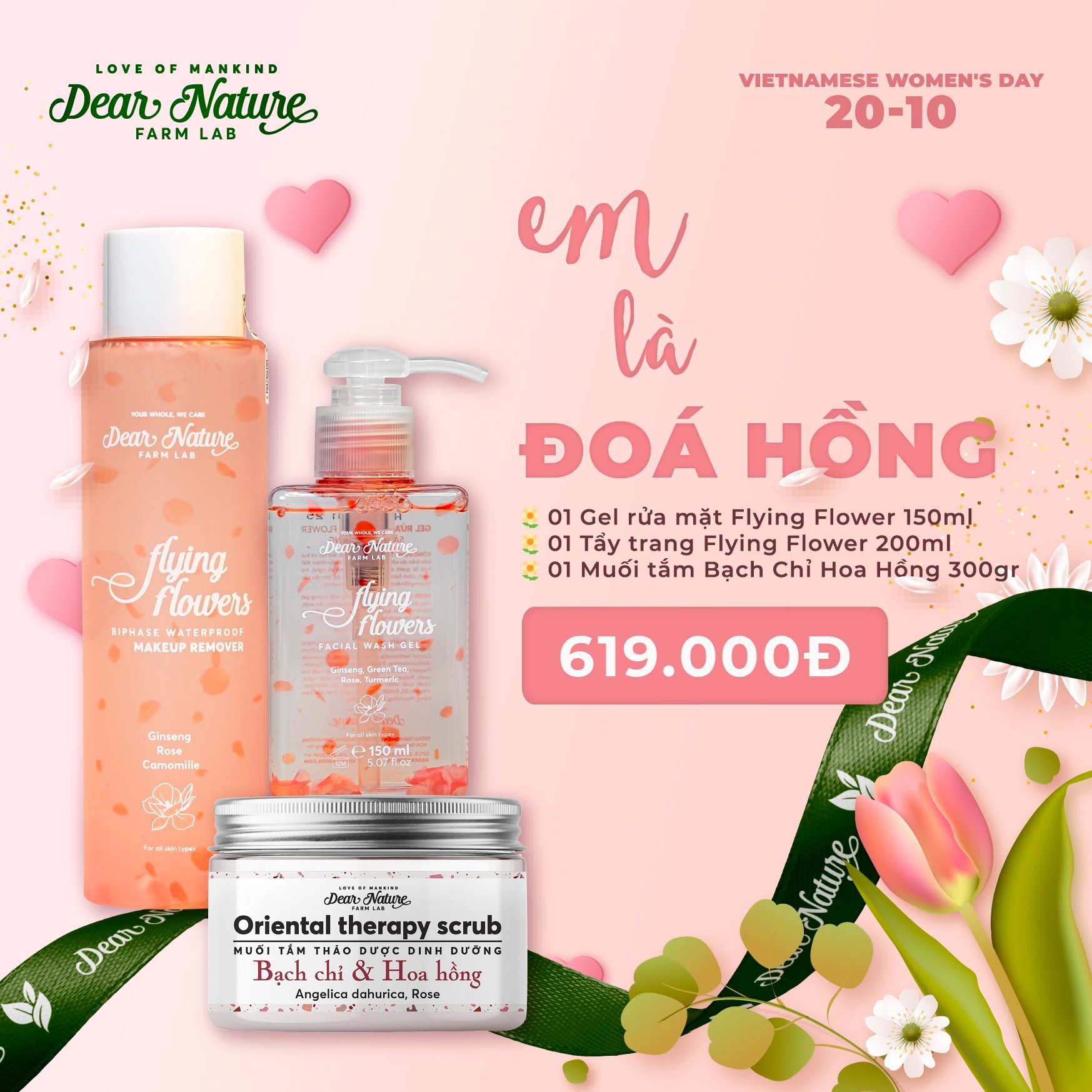 01 Gel rửa mặt cánh hoa bay Flying Flower 150ml + 01 Tẩy trang hoa bay Flying Flower 200ml + 01 Muối tắm dinh dưỡng Bạch Chỉ Hoa Hồng Oriental Therapy Scrub 300gr CHỈ CÒN 619K