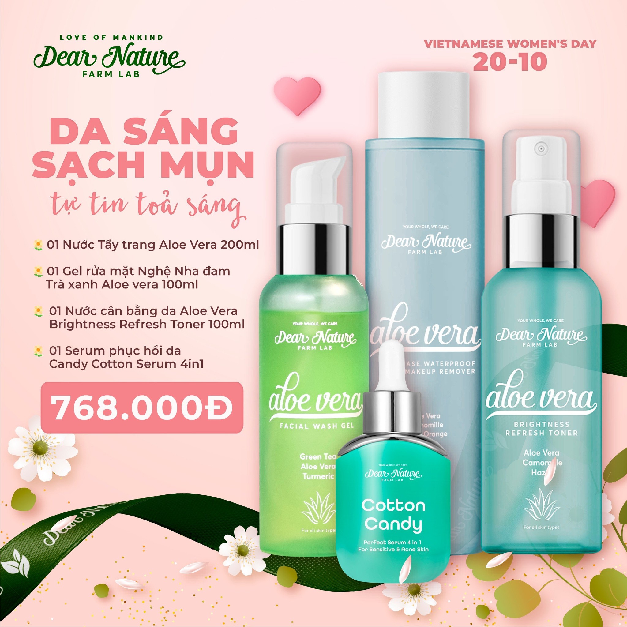 01 Nước Tẩy trang Aloe Vera 200ml + 01 Gel rửa mặt Nghệ Nha đam Trà xanh Aloe vera 100ml + 01 Nước cân bằng da Aloe Vera Brightness Refresh Toner 100ml + 01 Serum phục hồi da Candy Cotton Serum 4in1 For Sensitive & Acne Skin 15ml CHỈ CÒN 768K.