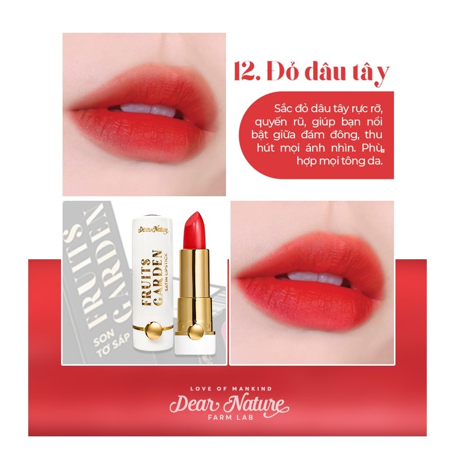 - Công thức thiên nhiên: Son tơ sáp Fruit Garden được tạo nên từ những thành phần thiên nhiên tinh khiết, không chứa các chất độc hại như silicone, paraben, chì, thuỷ ngân, đảm bảo an toàn tuyệt đối cho đôi môi.