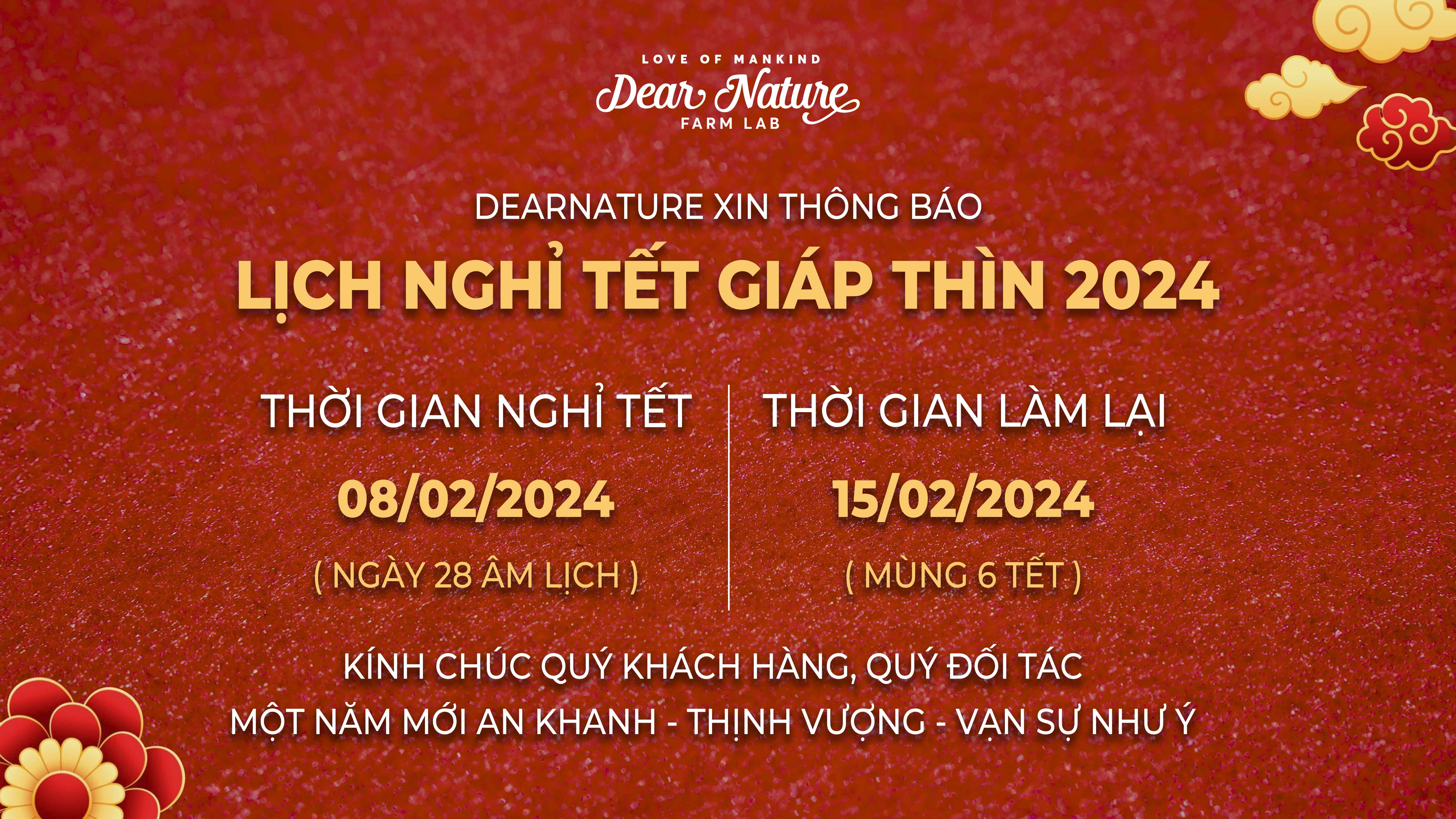 Lịch nghỉ Tết Nguyên Đán Giáp Thìn của Dear Nature - Khoẻ Tự Nhiên sẽ bắt đầu từ ngày 08/02/2024 (tức 29 Tết) đến hết ngày 14/02/2024 (tức ngày mùng 5 Tết âm lịch)