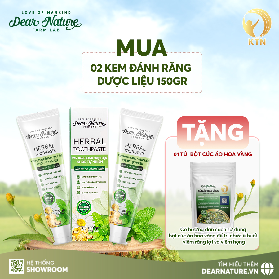 Khi mua 2 Kem đánh răng thảo dược Dear Nature 150gr, quý khách được 01 Túi bột hoa cúc áo vàng 100% hữu cơ tự nhiên (có hướng dẫn cách sử dụng bột cúc áo hoa vàng để trị nhức ê buốt viêm răng lợi và viêm họng).