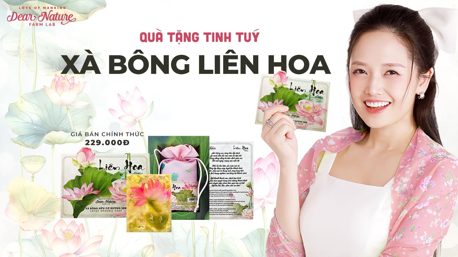 Xà bông Liên Hoa Dear Nature - món quà thiên nhiên cho làn da mềm mại, mịn màng. Tinh chất hoa sen thuần khiết kết hợp dầu dừa và dầu cọ hữu cơ, làm sạch sâu, dưỡng ẩm dịu nhẹ. Trải nghiệm ngay hôm nay với giá bán chính thức chỉ 229.000 VNĐ!
